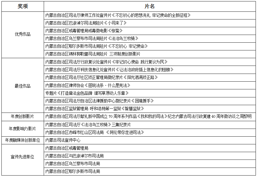 内蒙古自治区司法厅优秀影视作品分别在此次活动中荣获“优秀作品、最佳作品、年度创新影片、年度创新影片、年度影响力影片、年度融媒体创新单位、宣传先进单位、司法创新工作者”等奖项。